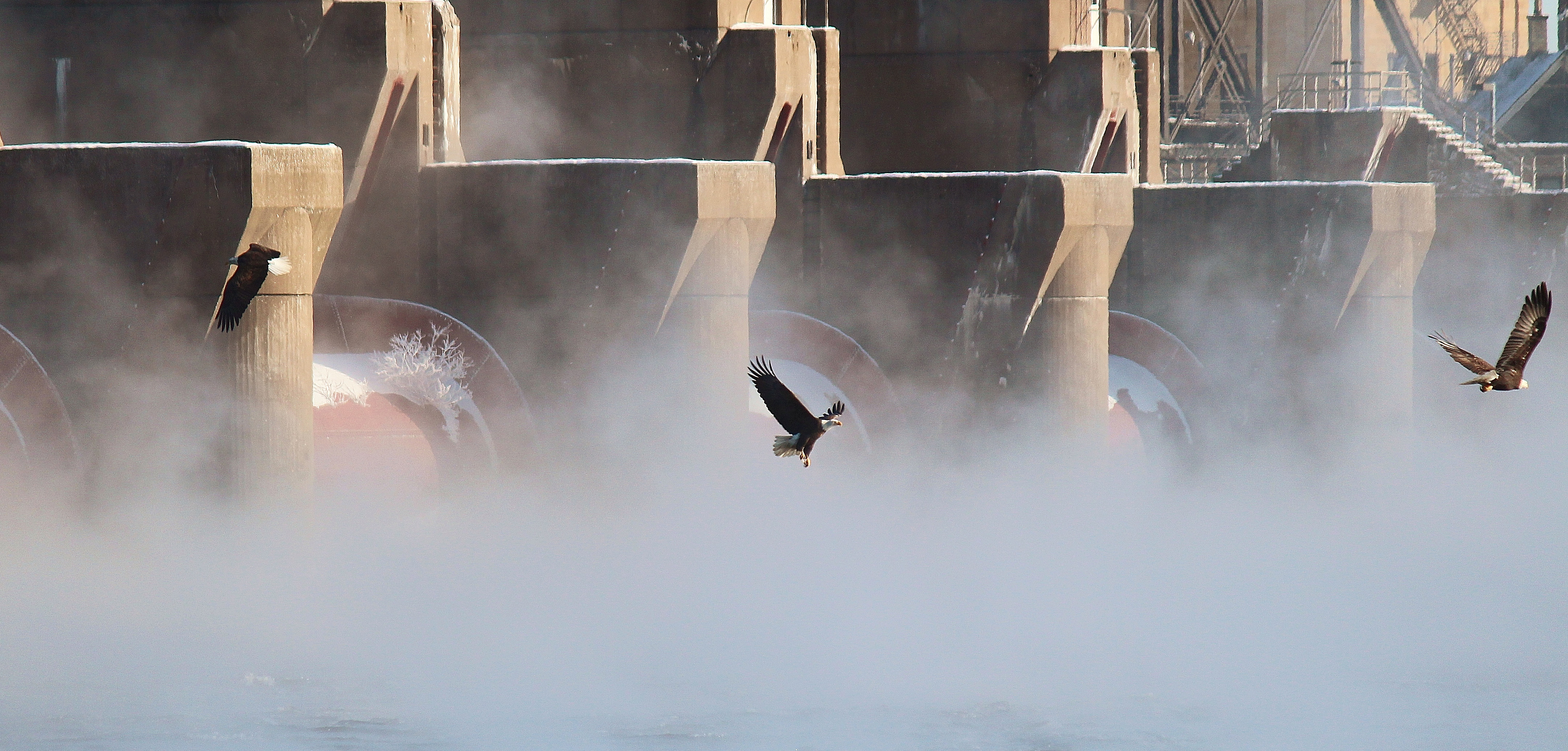 Bald Eagles flying below Lock and Dam 15 on the Upper Mississippi River
