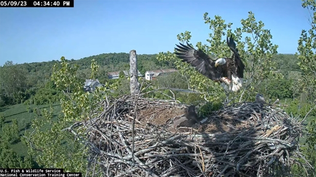 2023-05-09 Adult eagle landing in nest with a freshly caught fish – dinner for the eaglet