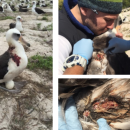 Clockwise from left: An bloody albatross sits on her nest. Staff examine a wounded bird. Close-up of injuries caused by a mouse attack.