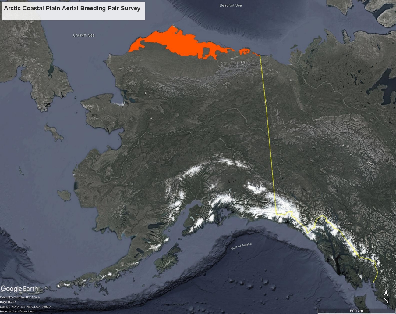 Map showing the location (in red) for the Arctic Coastal Plain Breeding Pair Aerial Survey in Alaska.