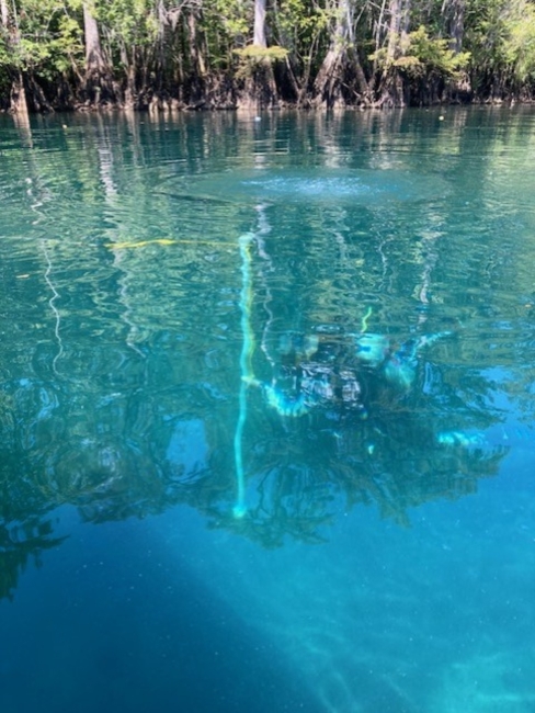 Adam Kaeser practices diving deployment of temperature array at Morrison Springs, FL.