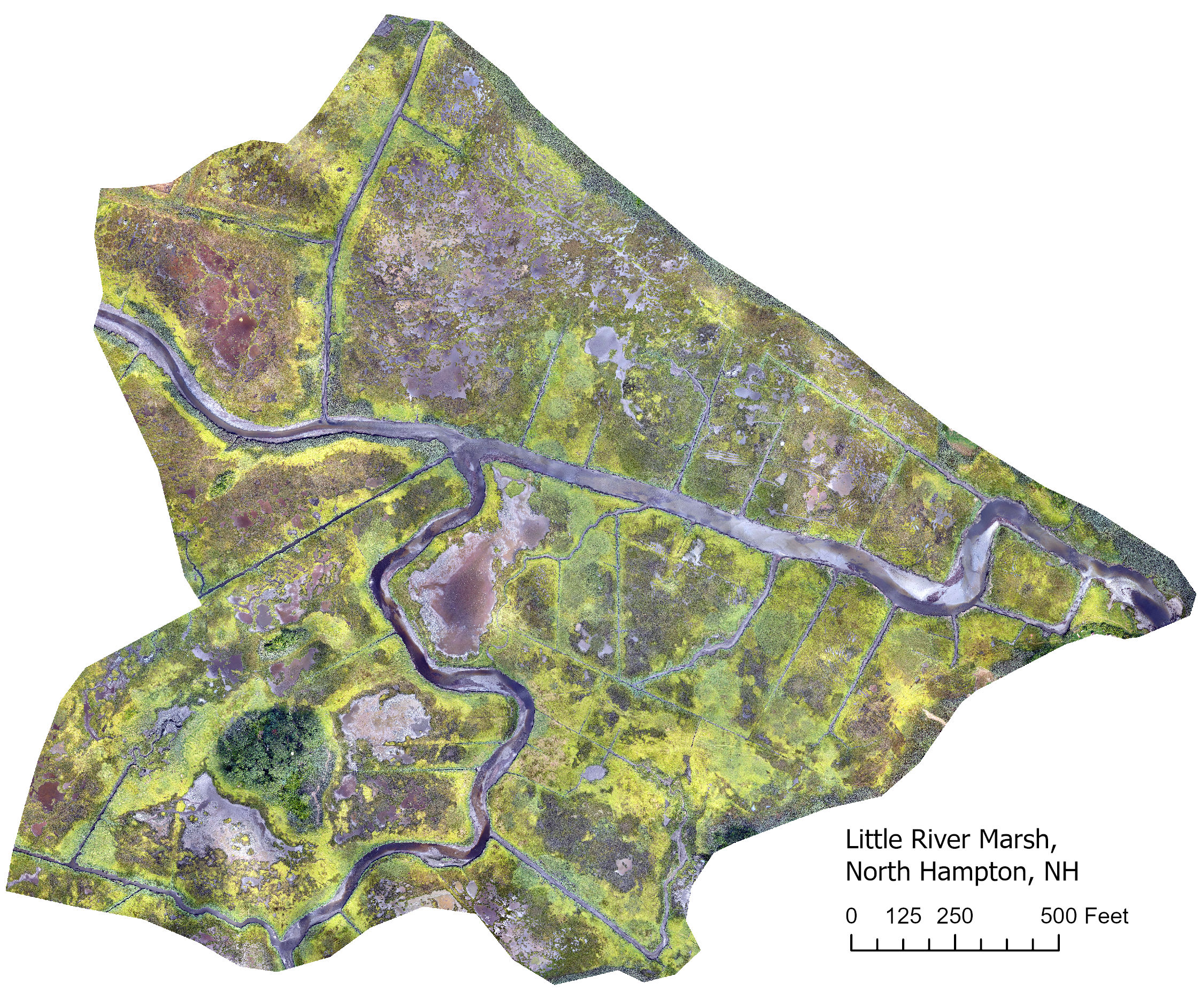 Aerial map of the Little River saltmarsh restoration site, created from drone imagery collected by USFWS-GOMCP in North Hampton, New Hampshire.