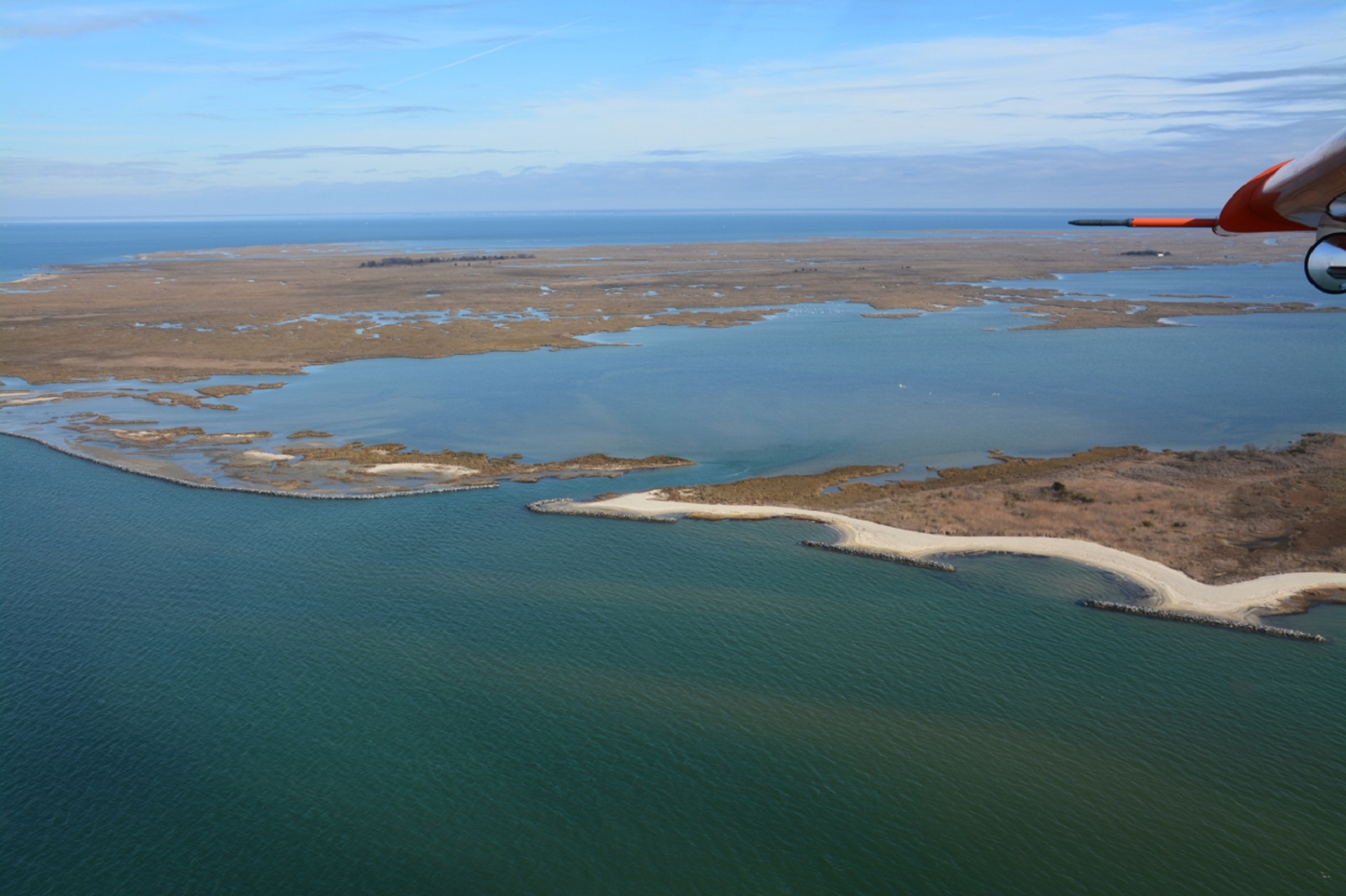 Aerial view of the living shoreline at Martin National Wildlife Refuge on the northern half of Smith Island in the Chesapeake Bay. The Fish and Wildlife Service used oyster reefs to stabilize 20,950 feet of shoreline, protecting more than 1,200 acres of tidal marsh, submerged aquatic vegetation and clam beds against storms. These saltwater habitats support the island's soft crab fishery, a natural resource that Smith Islanders depend on for their livelihoods.