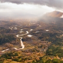 Aerial view of a river winding through fall tundra and cottonwood trees in a mountain valley on Kodiak Refuge.