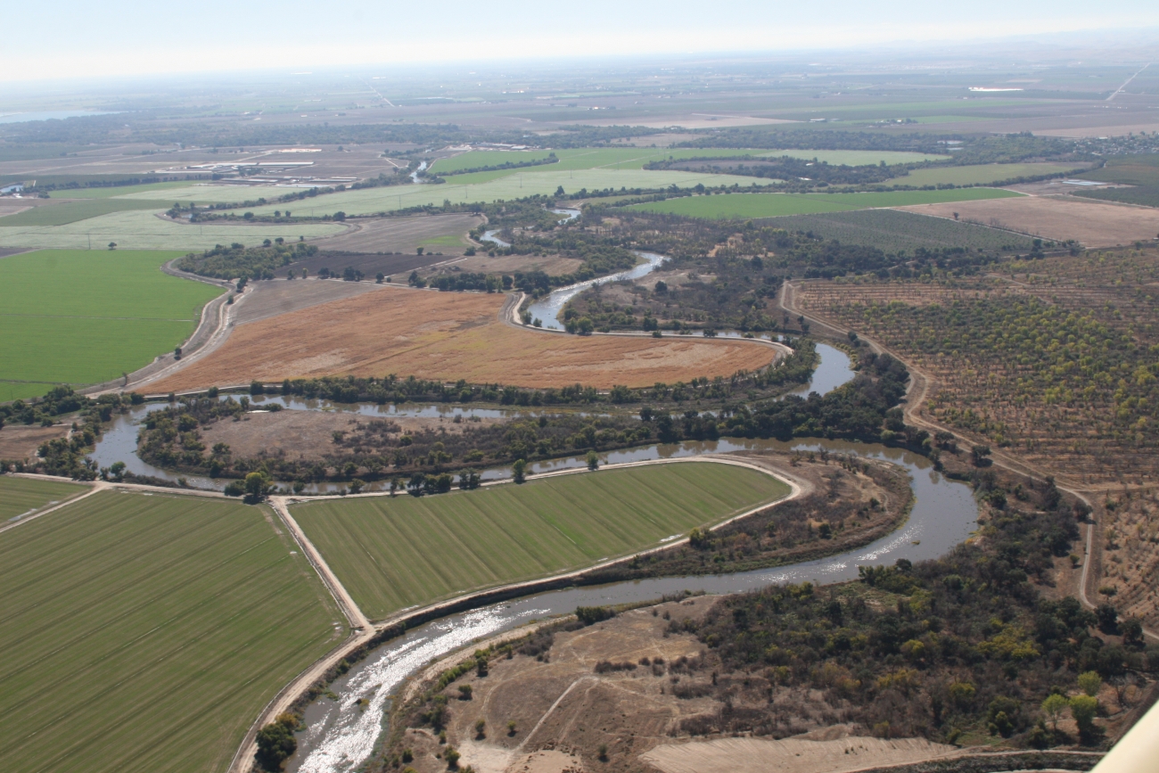 An aerial view of the San Joaquin River National Wildlife Refuge in California showing the San Joaquin River running through it.