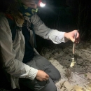 An intern with the American Conservation Experience, weighing a federally endangered Alabama beach mouse during the a 2020 Alabama beach mouse survey.