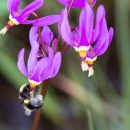 A bumblebee visits shooting stars (Dodecatheon pulchellum). These early bloomers flower along coastal meadows and sea cliffs. Note the pollen sac on the bee's hind legs.
