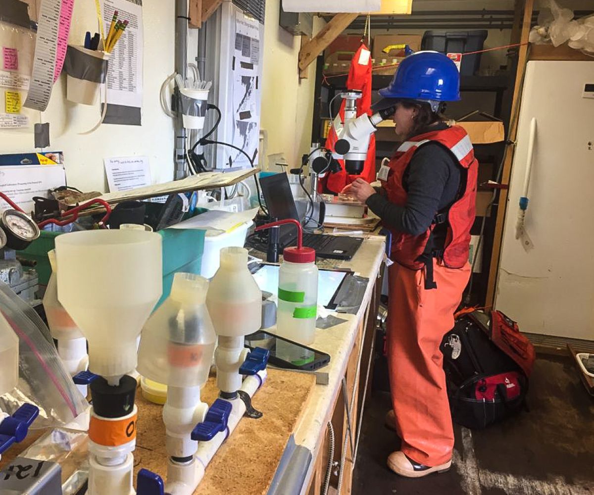 Processing plankton samples during the 2021 spring larval fish survey in the western Gulf of Alaska.