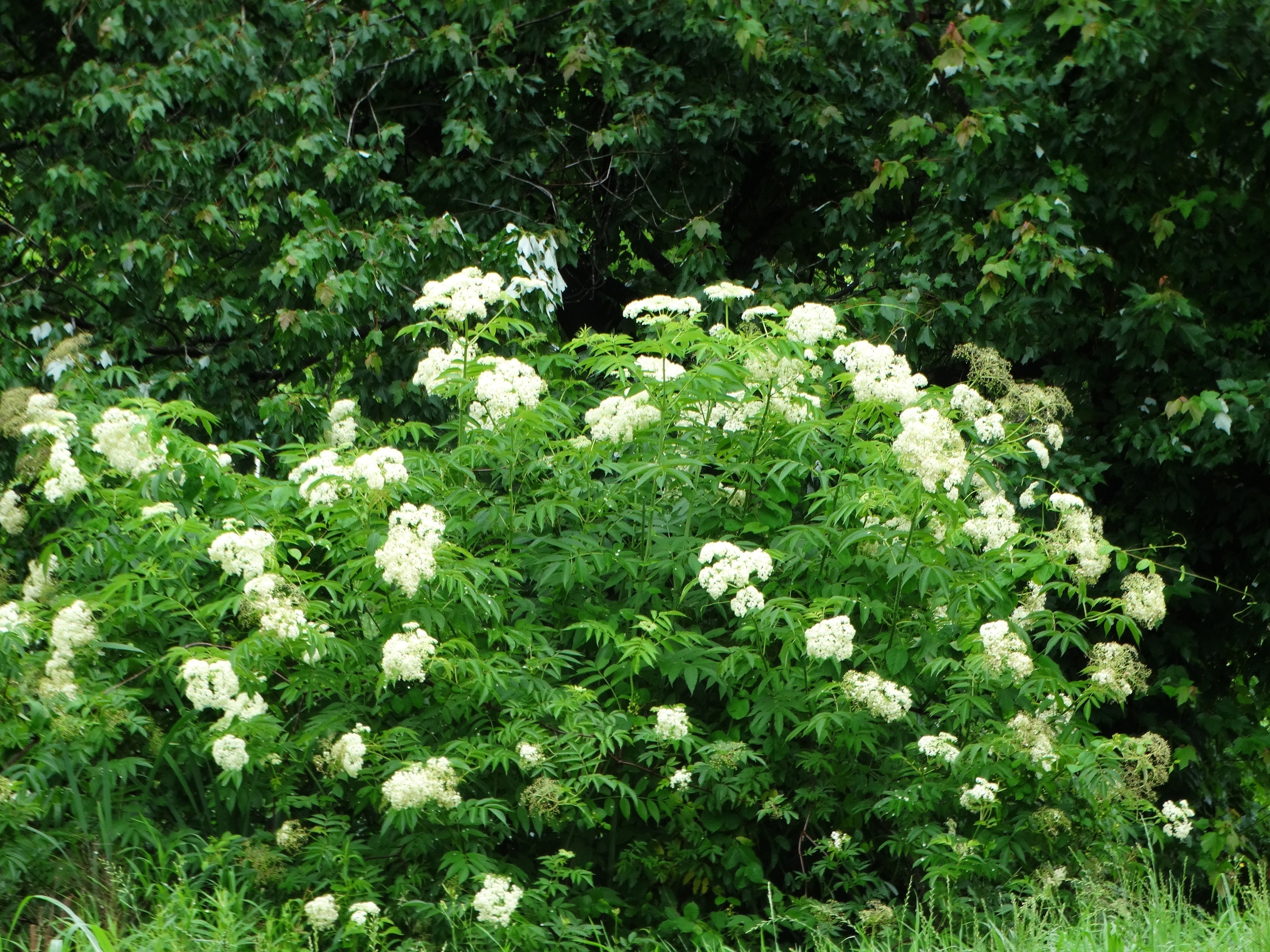 Bunches of 1 " diameter white flowers are scattered across a bright green shrub