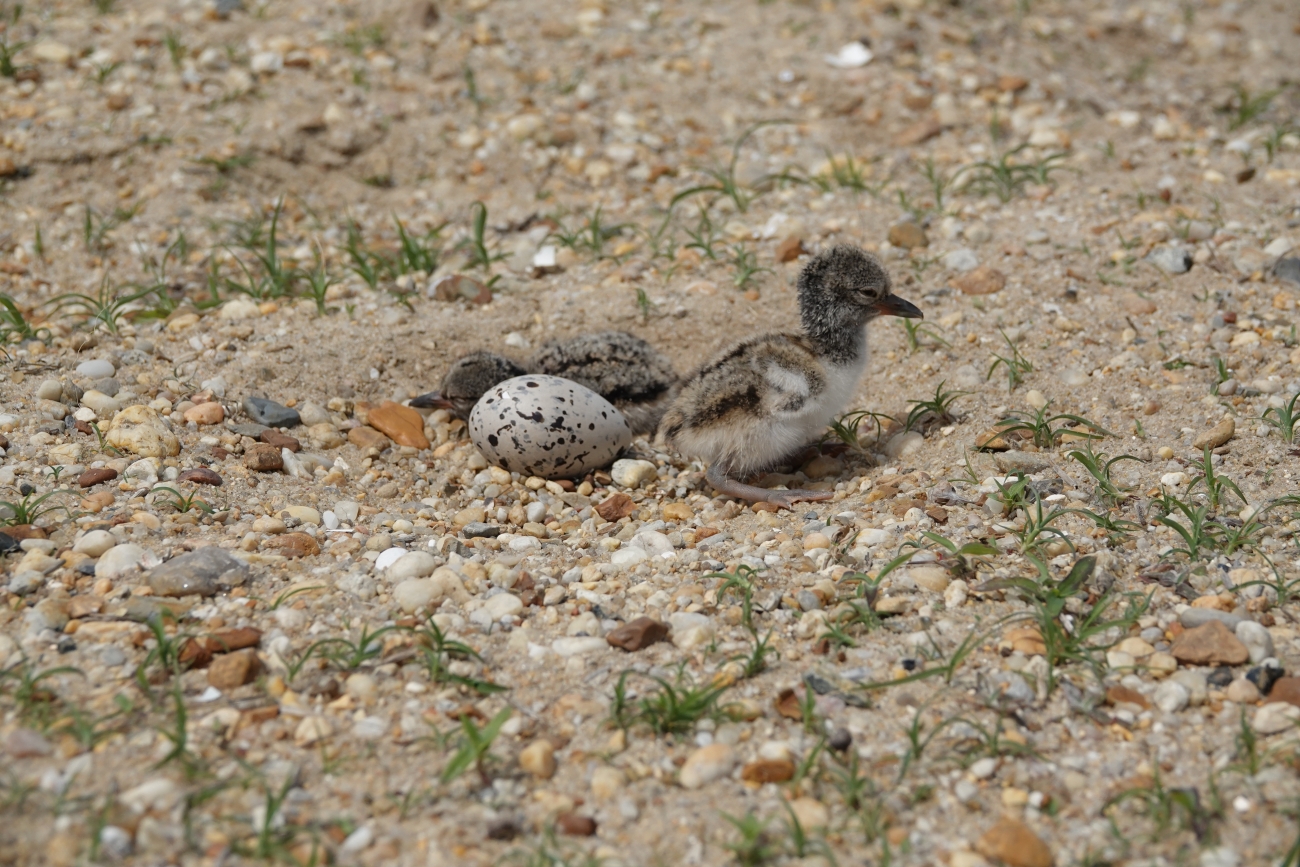 Two dark brown and white chicks and one black-speckled gray egg in a small depression on a sand and gravel beach. Little grasses are scattered around them. The chick farthest back is lying down, resting, while the chick in front is sitting up.