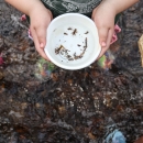 A student holds a bowl filled with aquatic invertebrates collected in North Carolina's South Toe River.
