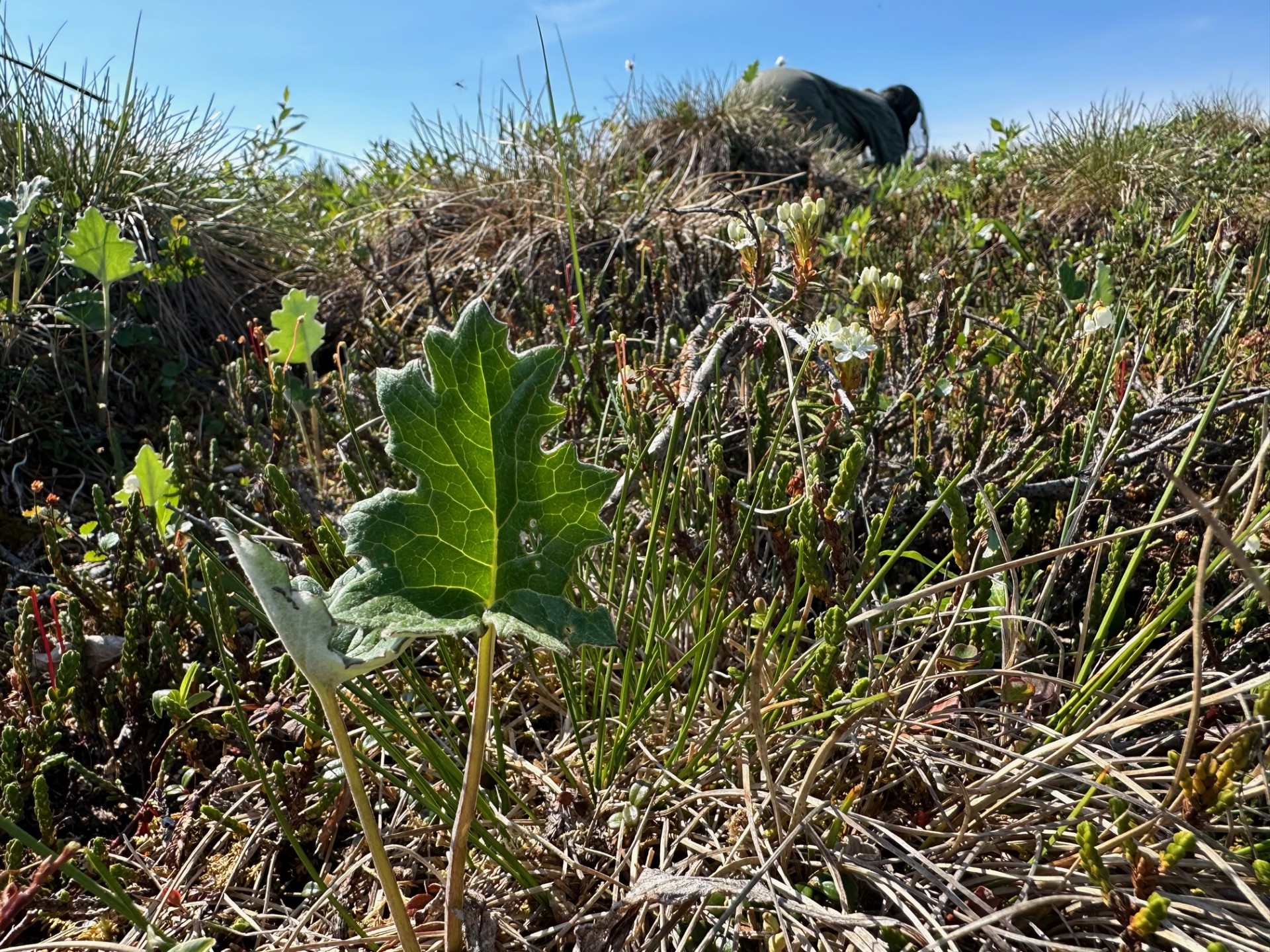 Photo of Arctic sweet coltsfoot (Petasites frigidus), the large single leaves in front, with a few more plants in the background. Heather Johnson/USGS
