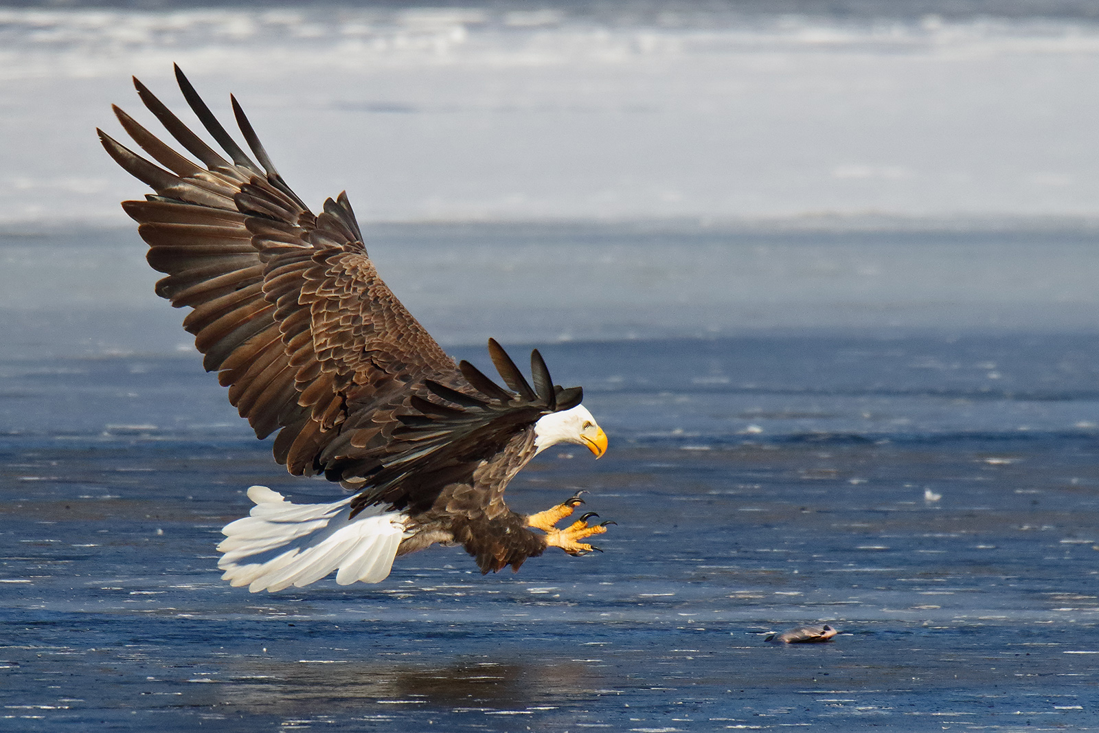 A bald eagle prepares to grab a fish off the surface of the ice on the Fox River in Illinois.