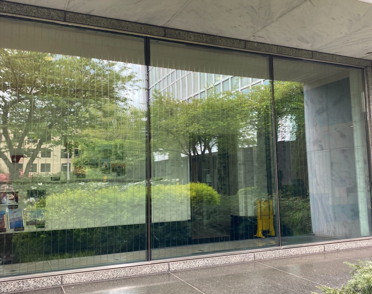 The barely-visible vertical lines on the windows prevent bird collisions. Hawthorn trees can be seen in the reflectio