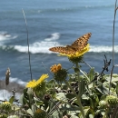 A Behren's silverspot butterfly (Speyeria zerene hippolyta) nectaring on coastal gumweed (Grindelia stricta).