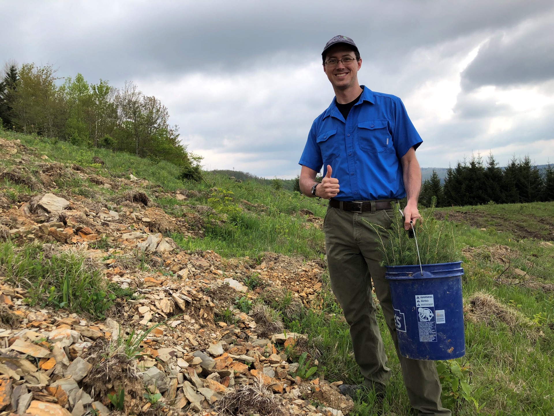 Ben Rhodes from The Nature Conservancy plants red spruce seedlings on the Mower Tract, a former mine site, in Monongahela National Forest.