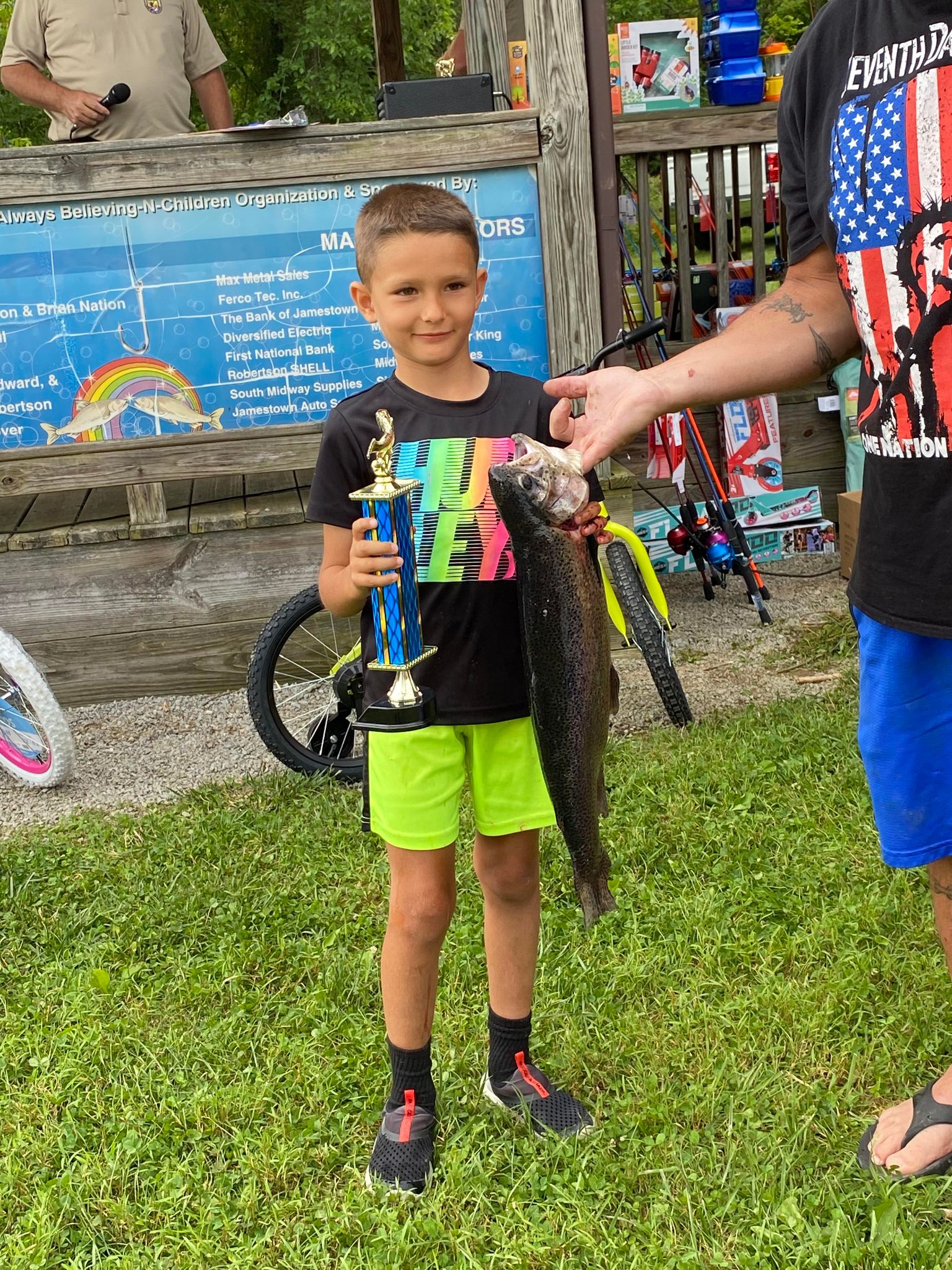 A participant of the 36th Annual Catch A Rainbow Kids Fishing Derby holding his trophy and keeper rainbow trout for catching the biggest fish in his age category.