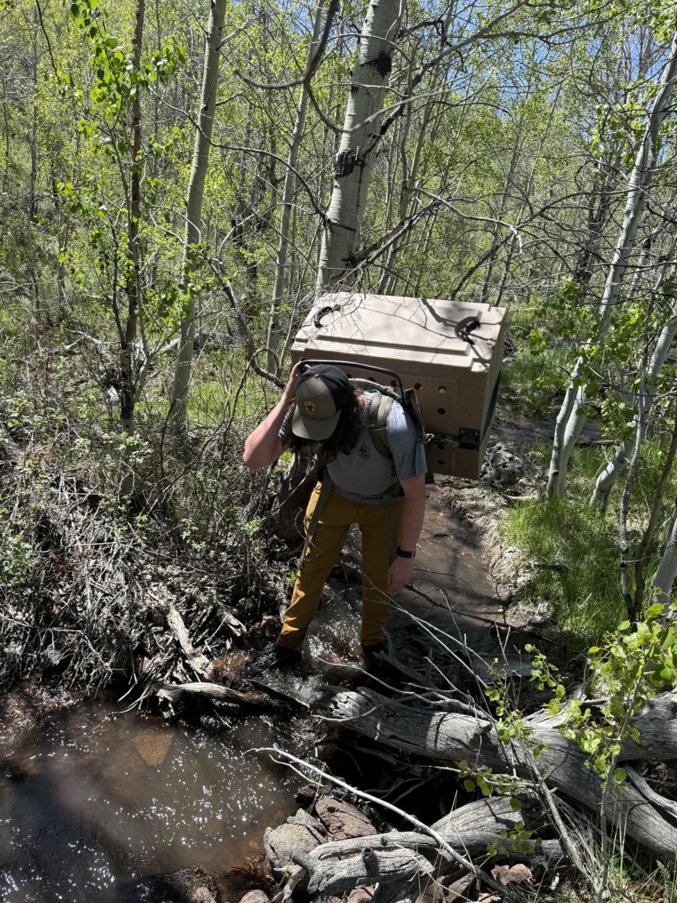The beavers are carried in something that looks like a dog kennel backpack. Though docile during transportation, the beavers quickly departed into Cottonwood Creek once released according to the biologists.