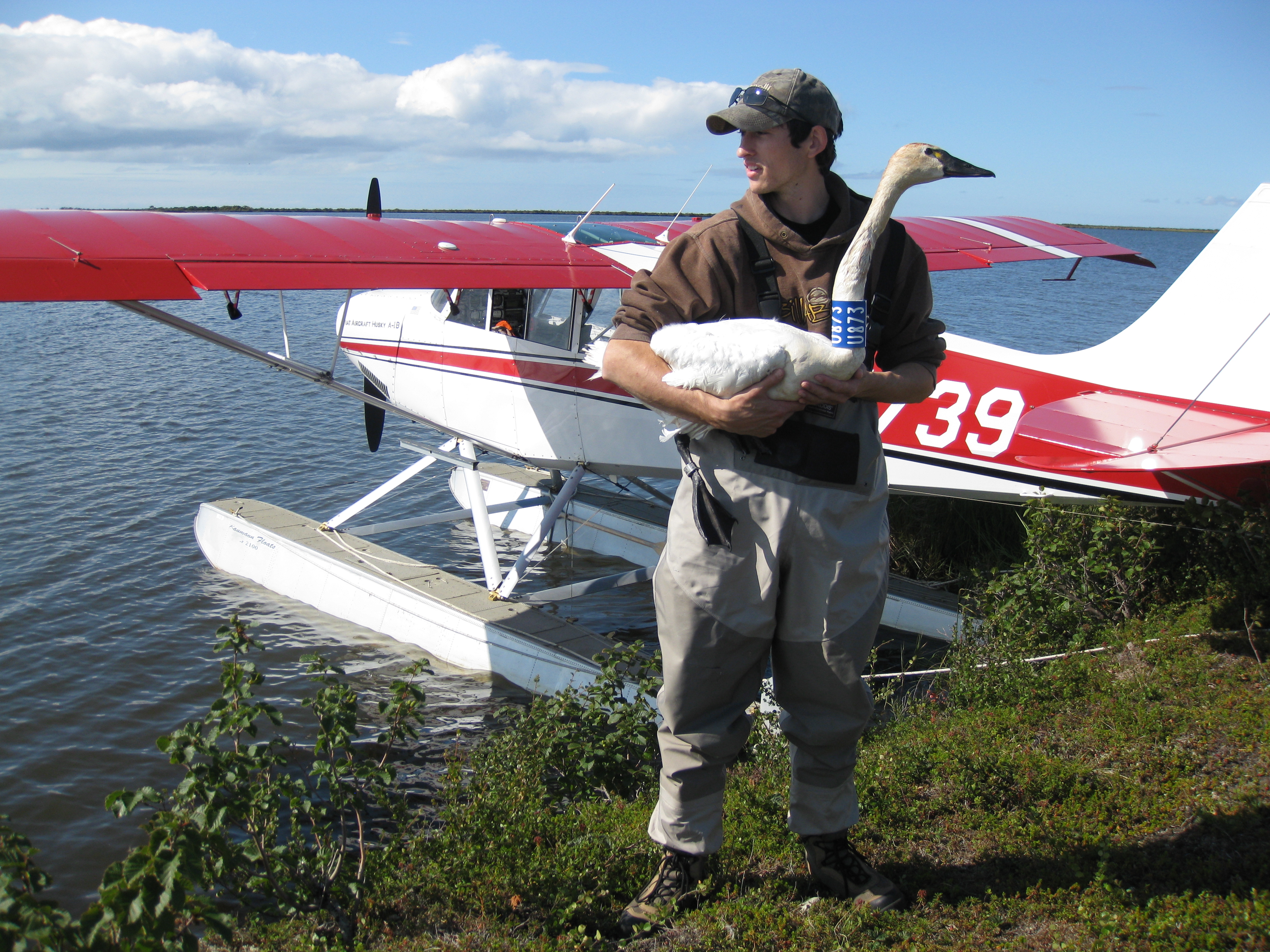 A pilot biologist holding a banded swan stands near a floatplane in Alaska.