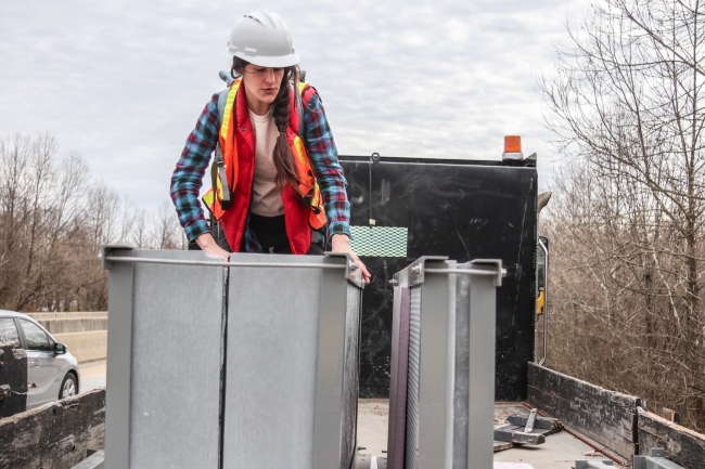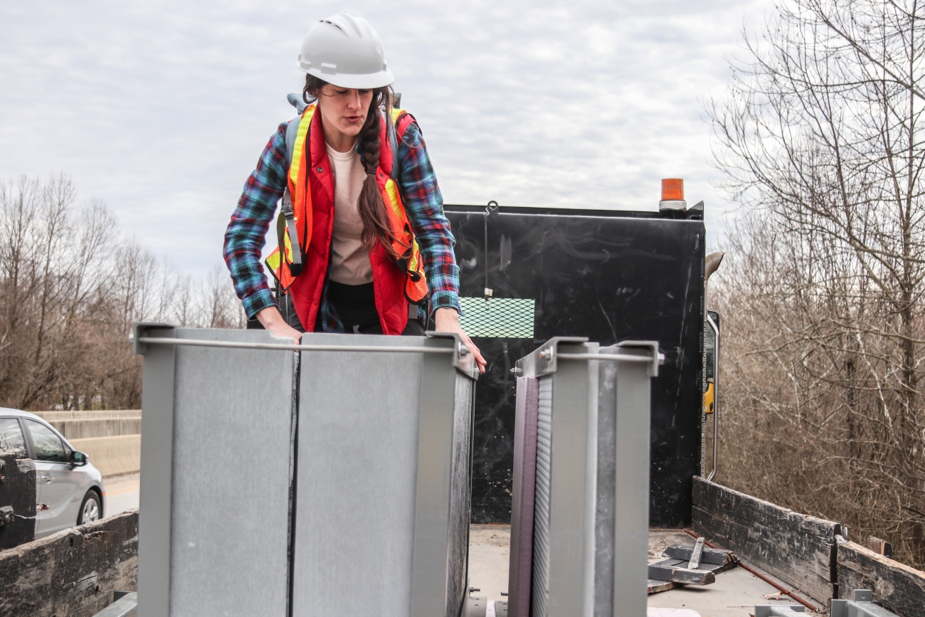 Asheville Field Office biologists Holland Youngman examines bat roosting structures to be installed by the North Carolina Department of Transportation on a bridge crossing the French Broad River.