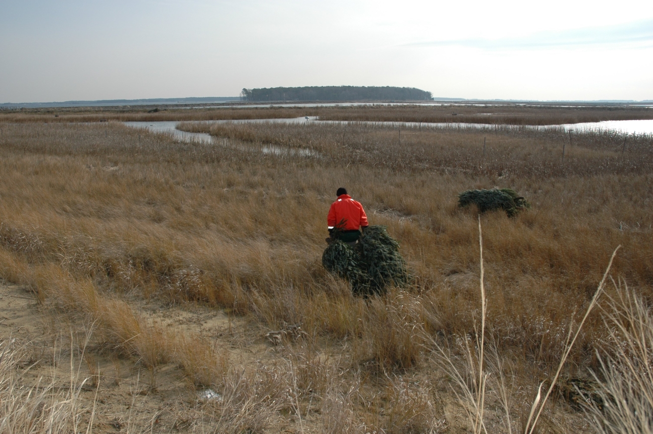 Biologist places Christmas trees on Poplar Island creating brush pile habitat for nesting birds credit Peter McGowan USFWS.jpg
