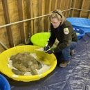 Mary Kay Skoruppa, U.S. Fish and Wildlife Service Sea Turtle Coordinator for Texas, processing a cold-stunned green sea turtle on the Texas coast.
