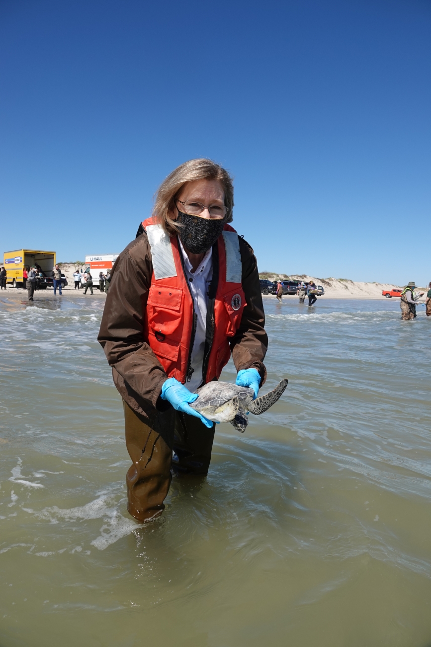 Mary Kay Skoruppa, U.S. Fish and Wildlife Service Sea Turtle Coordinator for Texas, releasing a rehabilitated green sea turtle into the Gulf of Mexico