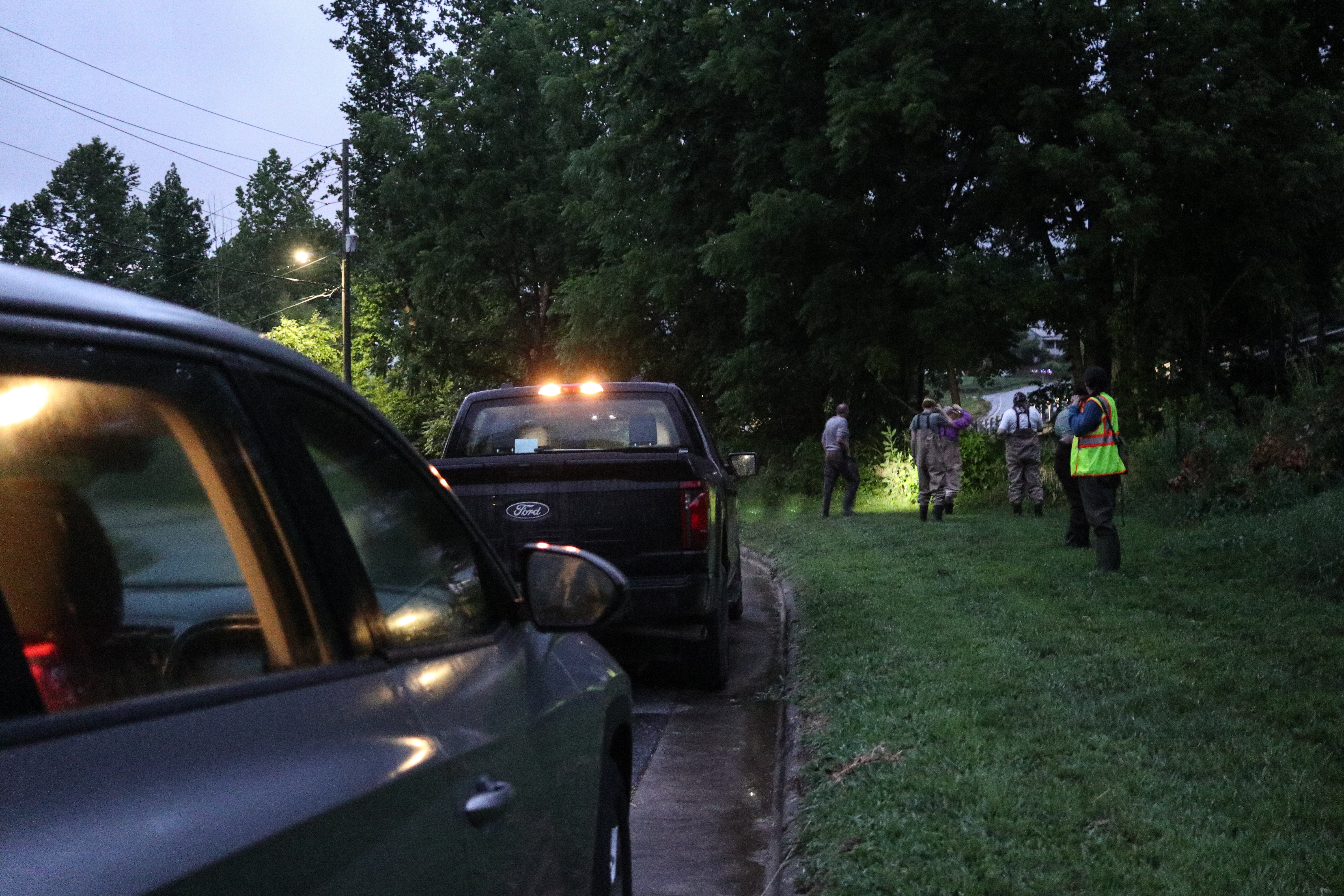 Biologists head to the Pigeon River to conduct a bat emergence count at a bridge, Haywood County, NC.