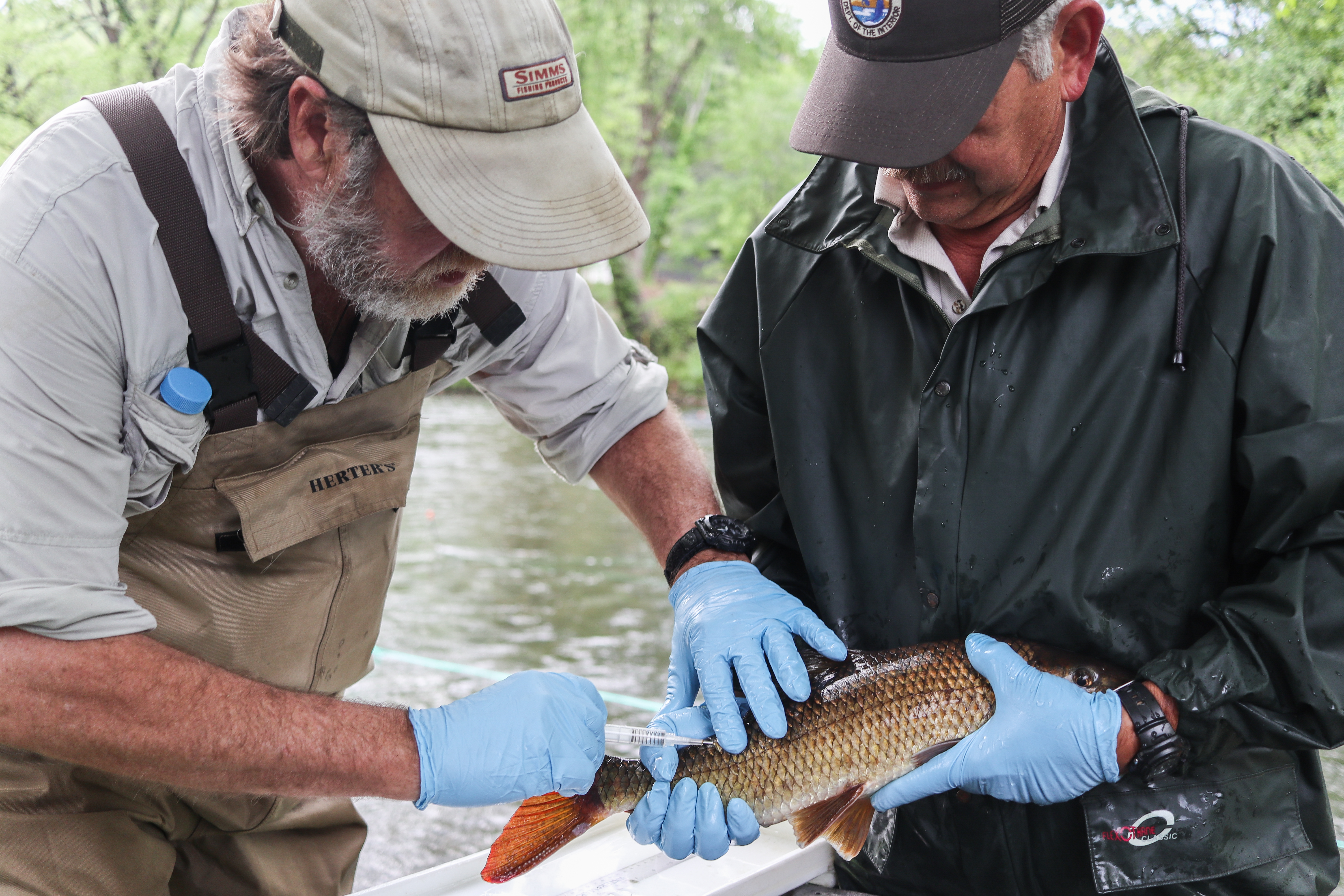 Biologists insert a Passive Integrated Transponder, or PI, tag into a sicklefin redhorse