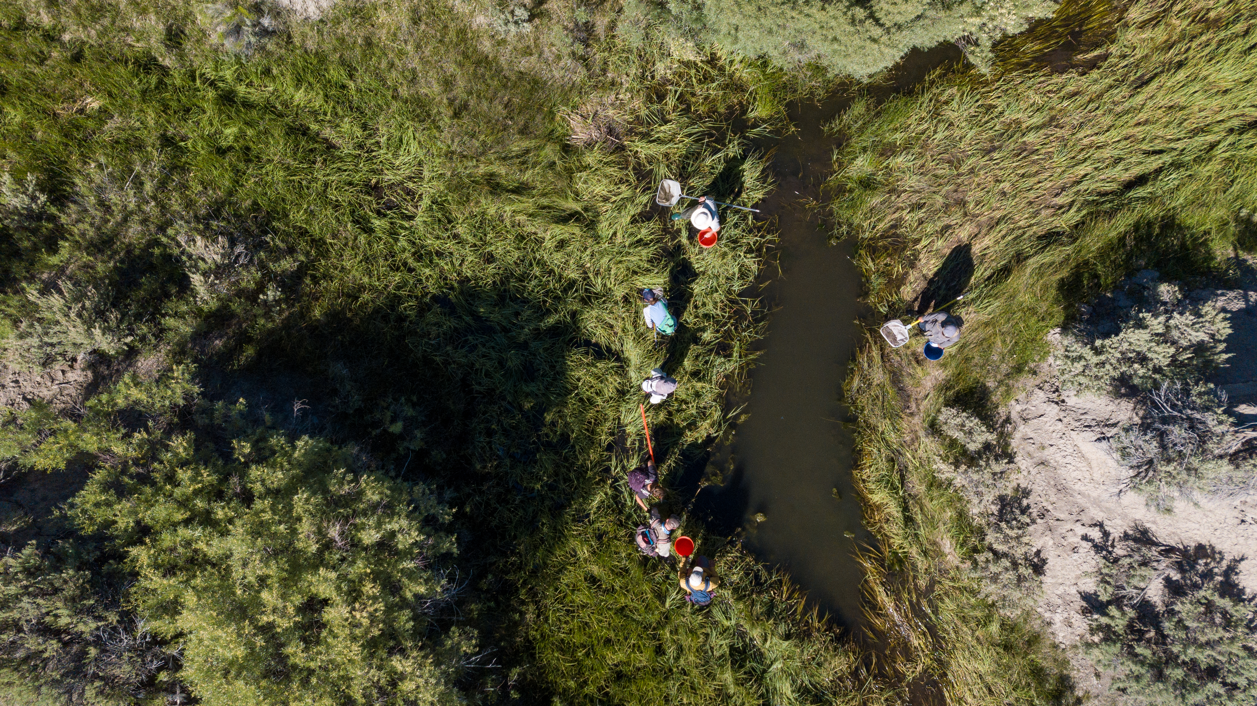 A group of biologists stand by a pond looking for Columbia spotted frogs.