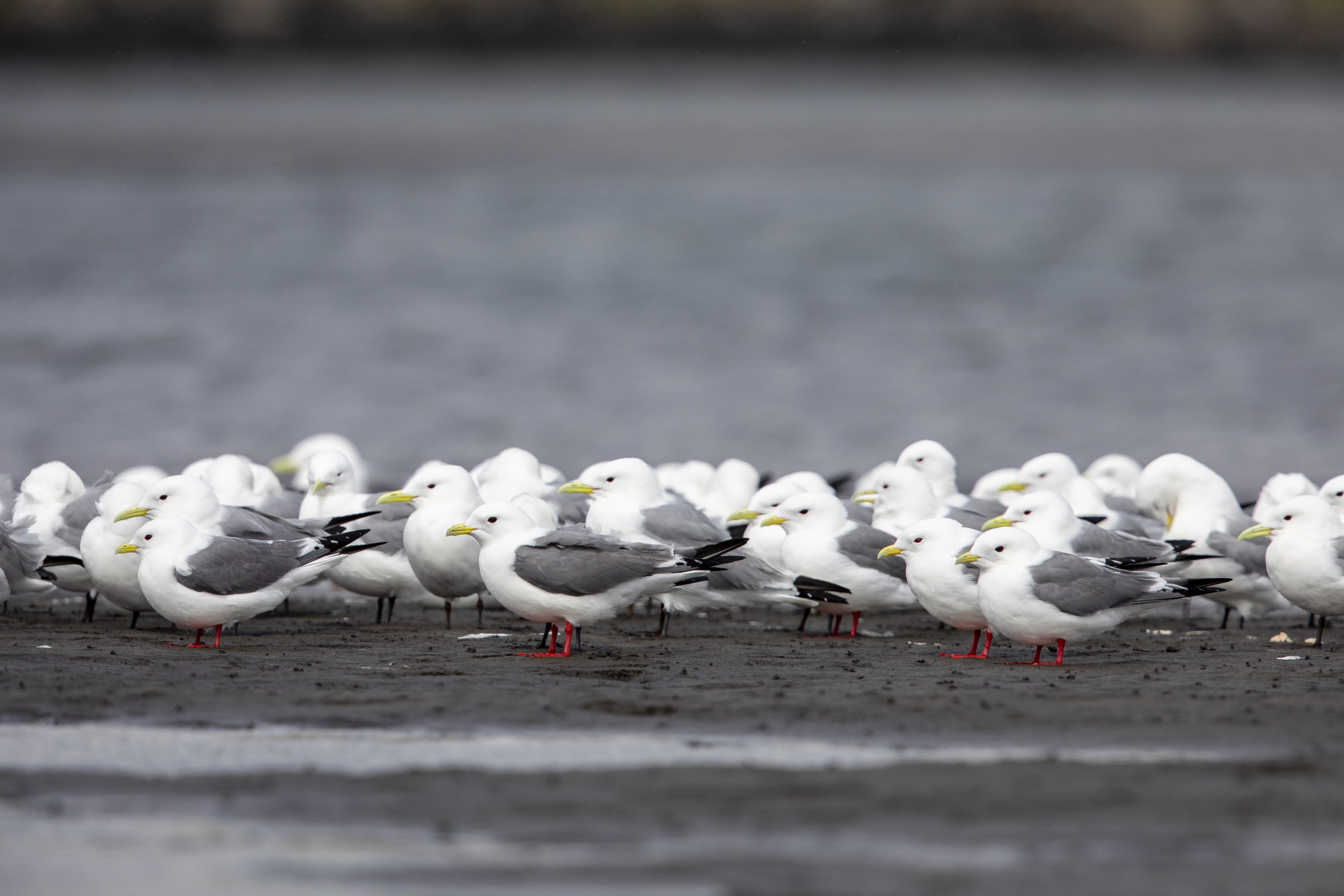 A mixed group of red-legged and black-legged kittiwakes on a St. Paul Island beach, Alaska.