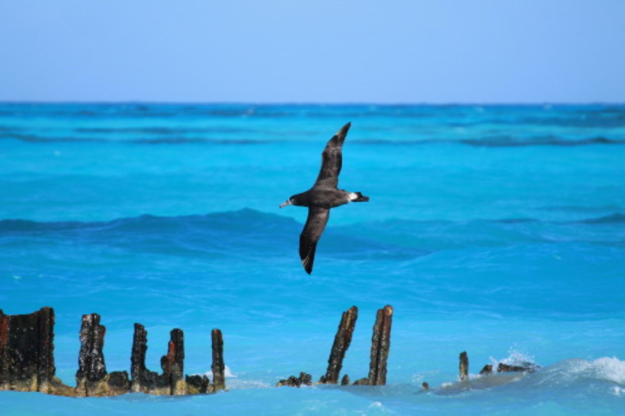 A black-footed albatross flies over the ocean at Midway Atoll National Wildlife Refuge in the Pacific.