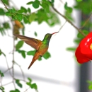 A buff-bellied hummingbird hovers near a bird feeder at Santa Ana Refuge in south Texas.