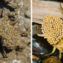 Left: Wolf spider with hatched young. Credit: Megan Seymour/USFWS. Right: Giant water bug with eggs. Source: Josh More (CC BY-NC-ND 2.0)