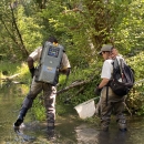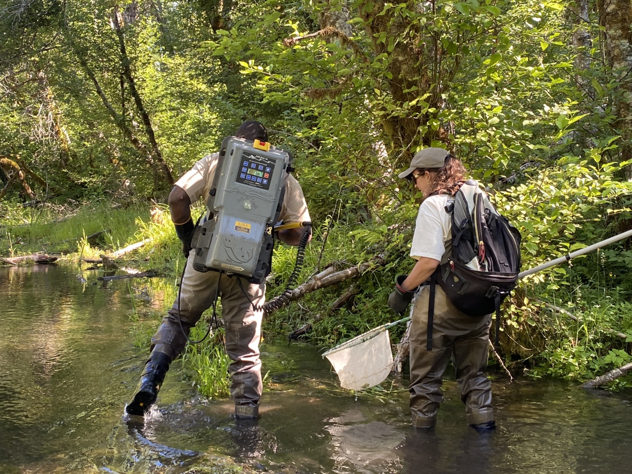 Rikeem Sholes wears an electro-shocking backpack, while Julianne Harris nets the shocked bull trout in Tyee Springs.