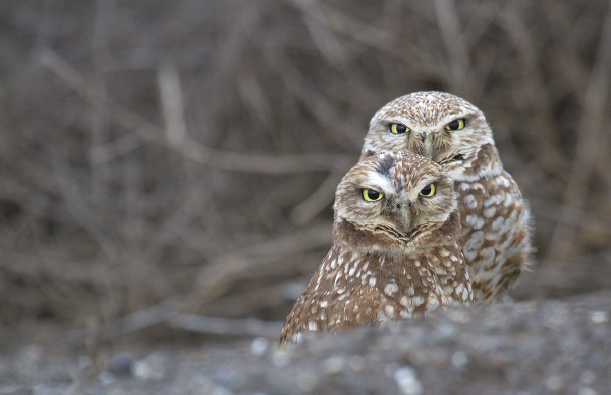 Burrowing owls at the Merced National Wildlife Refuge in California. Unlike many other owl species that use high perches, burrowing owls use ground burrows created by rodents and other animals. © Rick Lewis