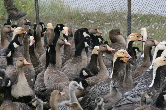 Cackling Canada and emperor geese wait to be banded on the Yukon Delta National Wildlife Refuge, Alaska.