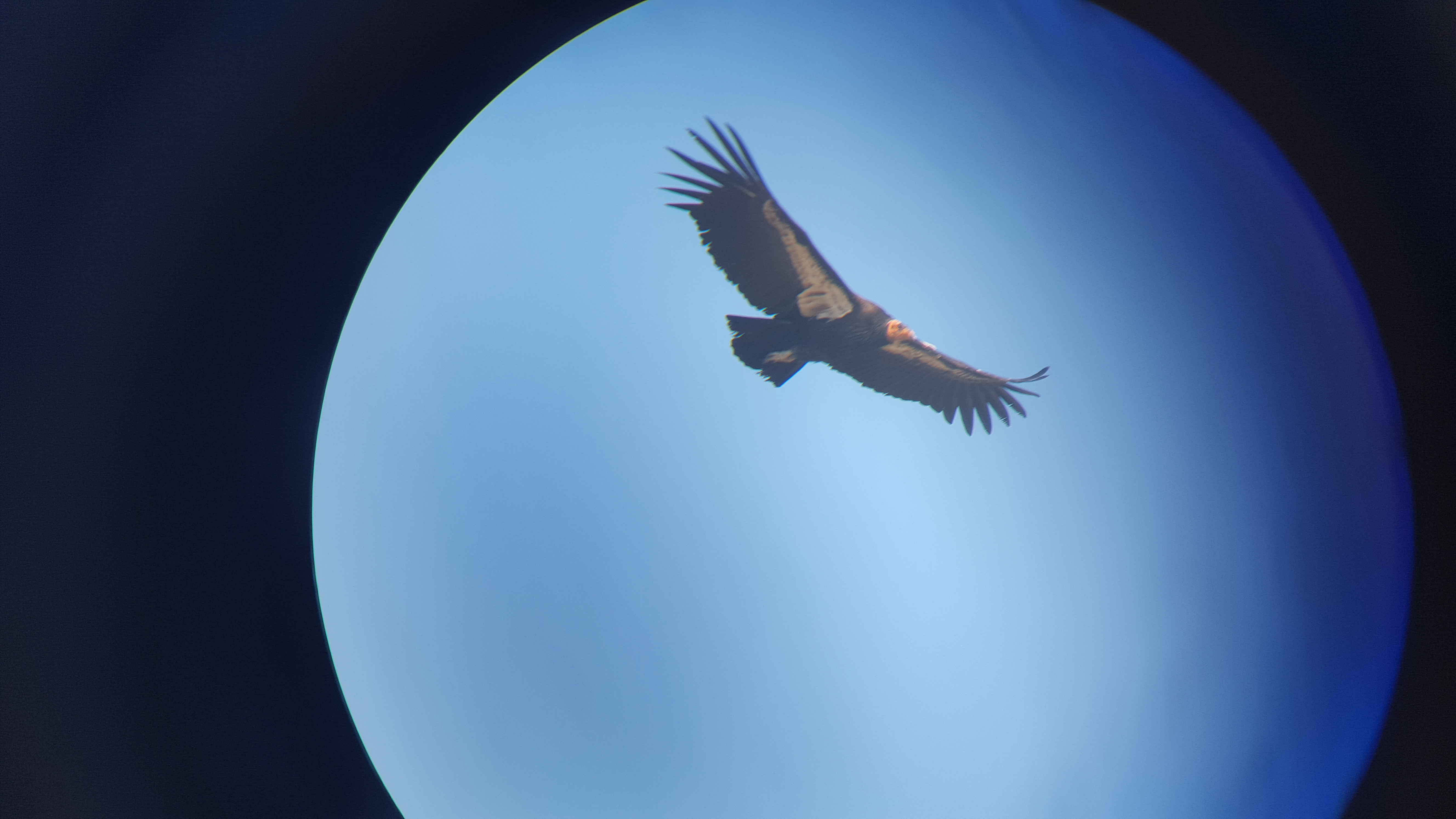 A soaring California condor viewed through a scope at Hopper Mountain National Wildlife Refuge, Feb 2016