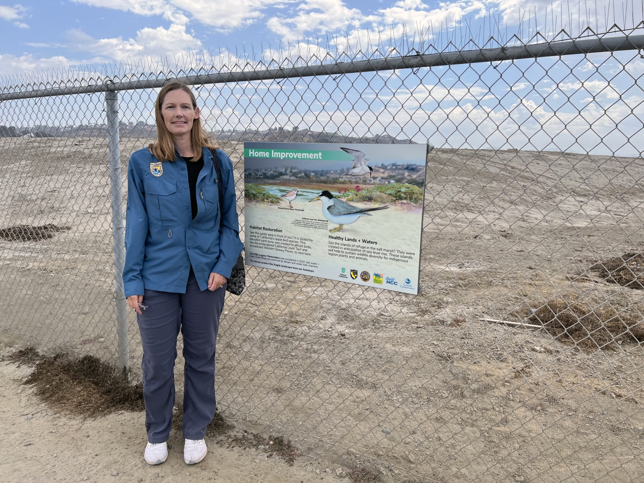 Sally Brown, Carlsbad Fish and Wildlife Office Biologist, stands next to the new California least tern nesting site. Credit: USFWS