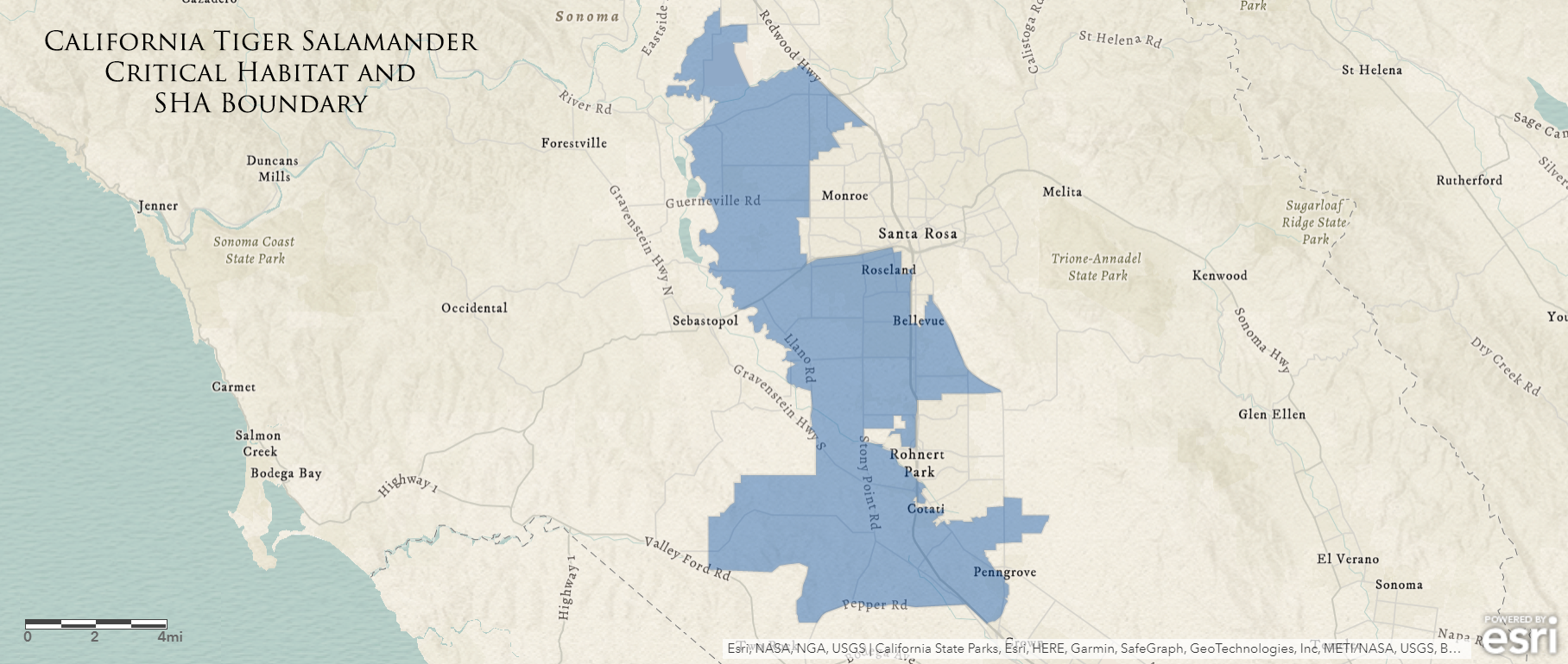 Vineyards within the boundary of California tiger salamander critical habitat in Sonoma County, mainly in the Santa Rosa Plain, are eligible to join the Safe Harbor Agreement.