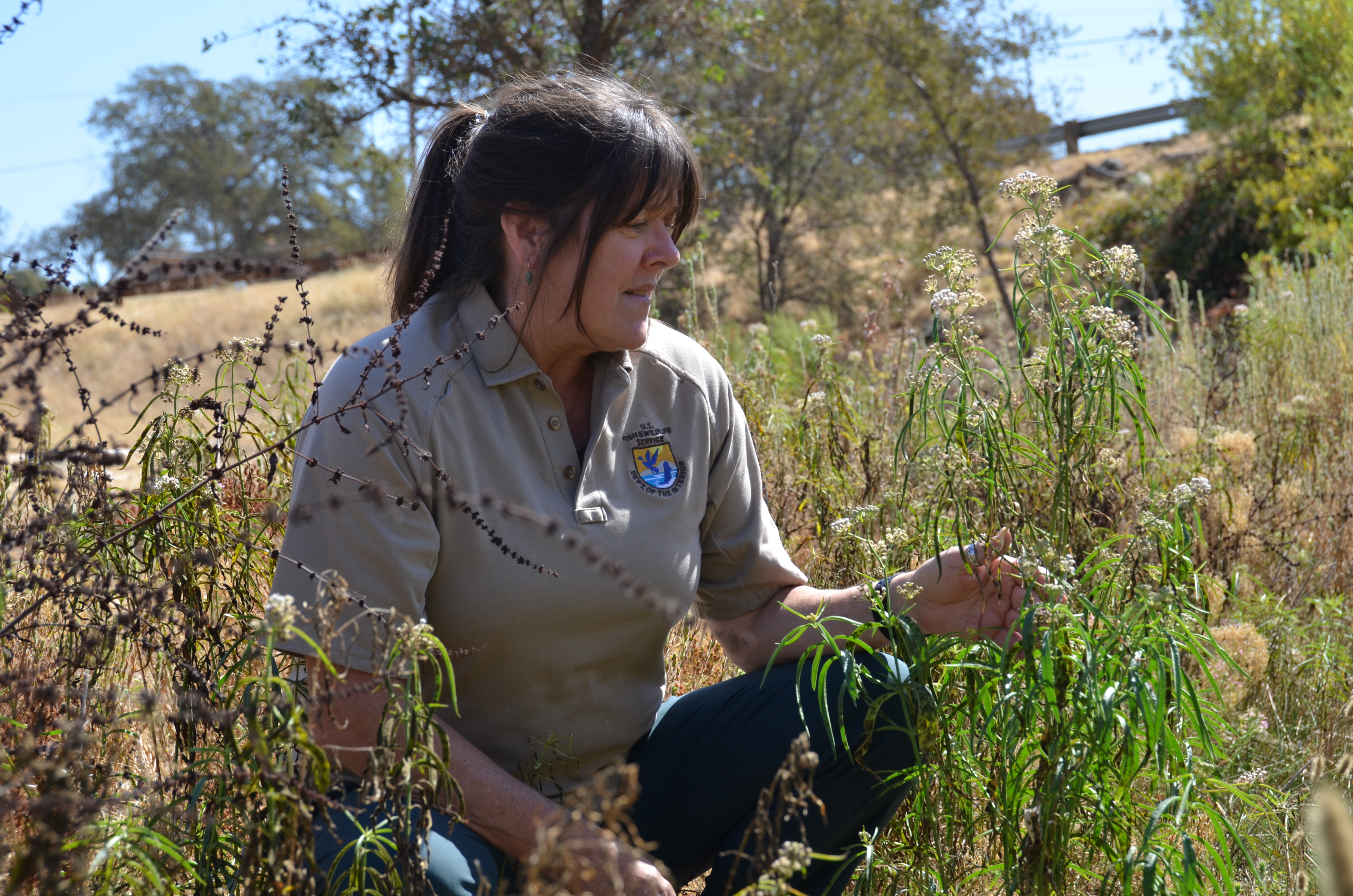 Cathy Johnson looking for monarch caterpillars at Beale Air Force Base