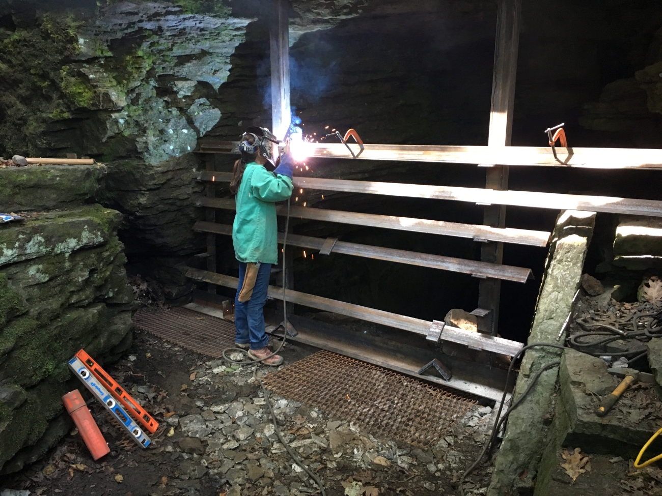 Welding cave gate on a hibernacula at Devil's Den State Park.