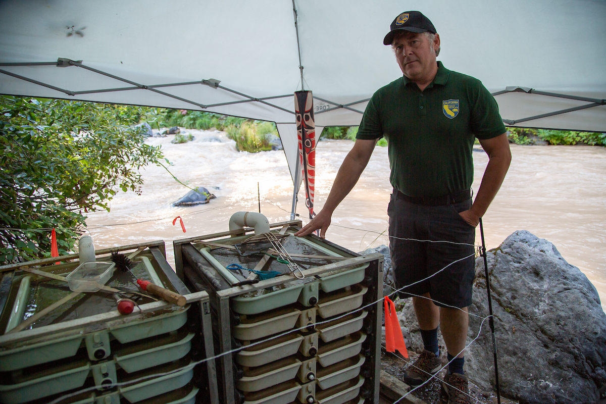 Matt Johnson, senior environmental scientist for the California Department of Fish and Wildlife (CDFW), explains the incubation system on the McCloud River where winter-run Chinook salmon eggs are held while they mature before being released into the river. This system combines components of a remote-site incubator with a system of trays from CDFW’s Mount Shasta Fish Hatchery to ensure mud from the river won't suffocate the eggs.