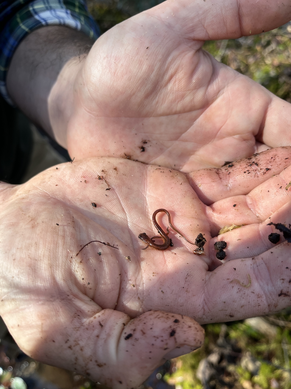 Biologist holding a small Chamberlain's dwarf salamander.