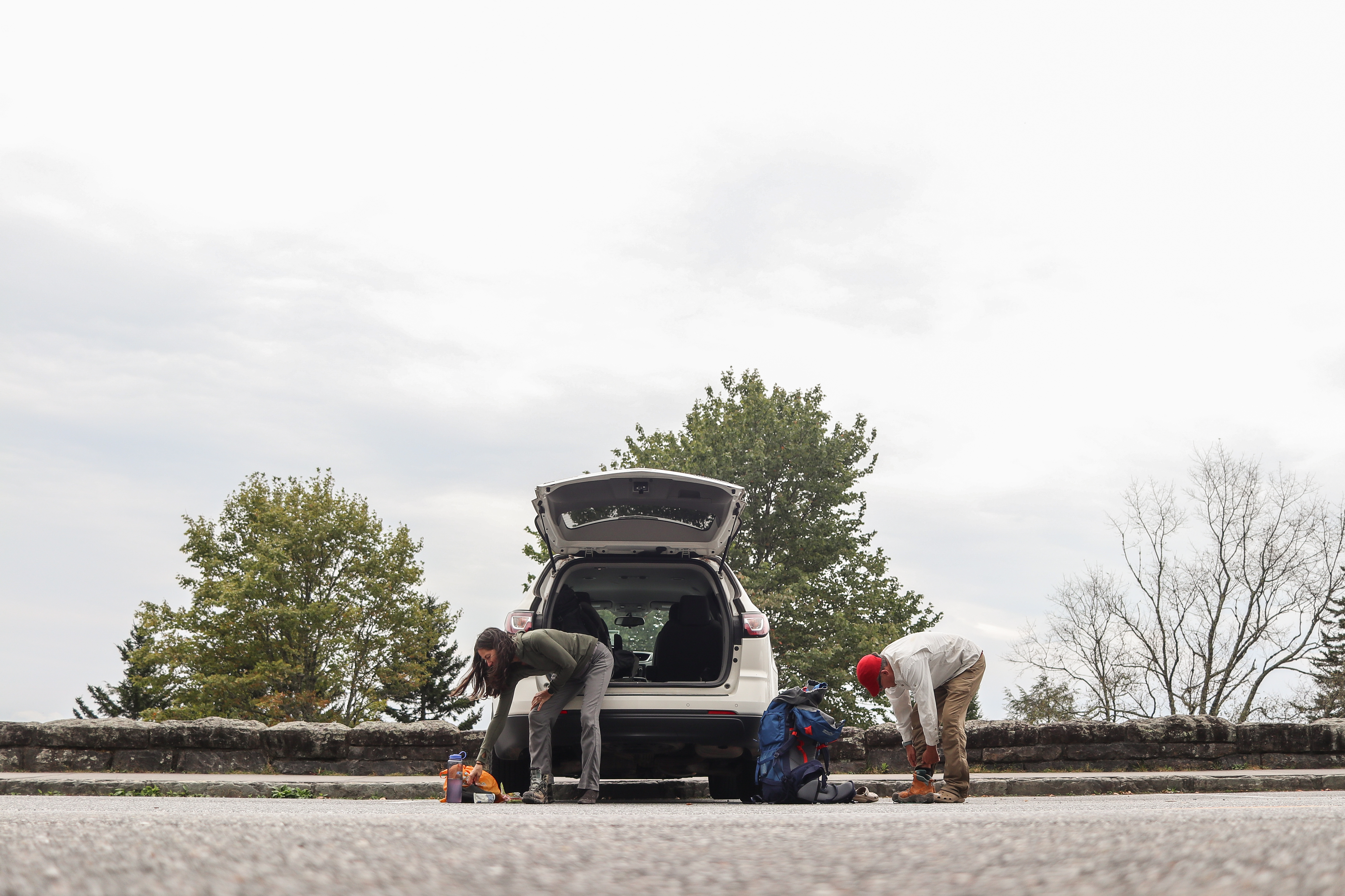 Sue Cameron and Mark Endries, both US Fish and Wildlife Service, prepare to head home after monitoring spruce-fir moss spiders in the backcountry of Great Smoky Mountains National Park.