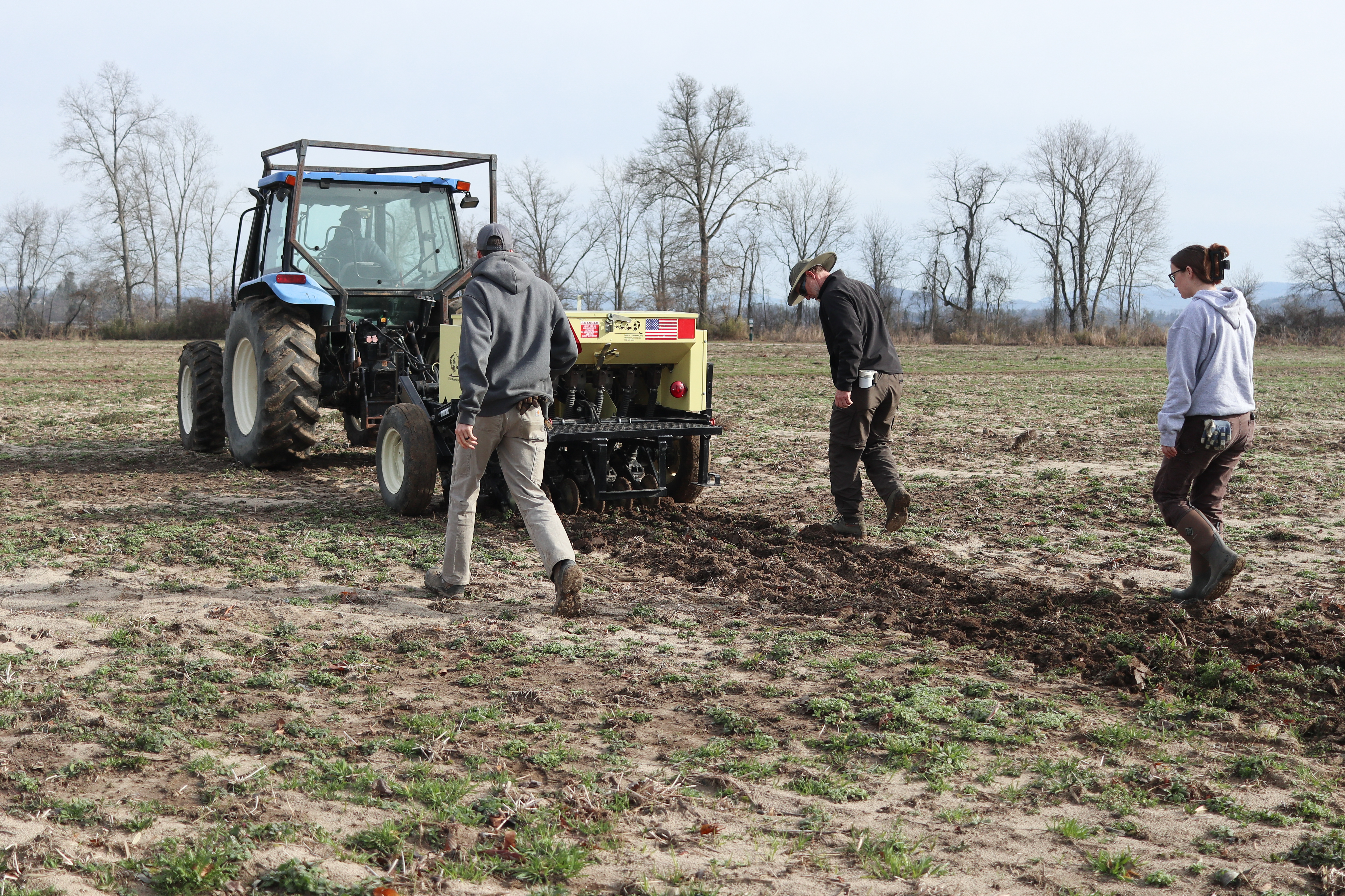 Aaron Davenport, Bryan Tompkins, and Kai Picciano walk behind a seed drill, ensuring everything is working properly.