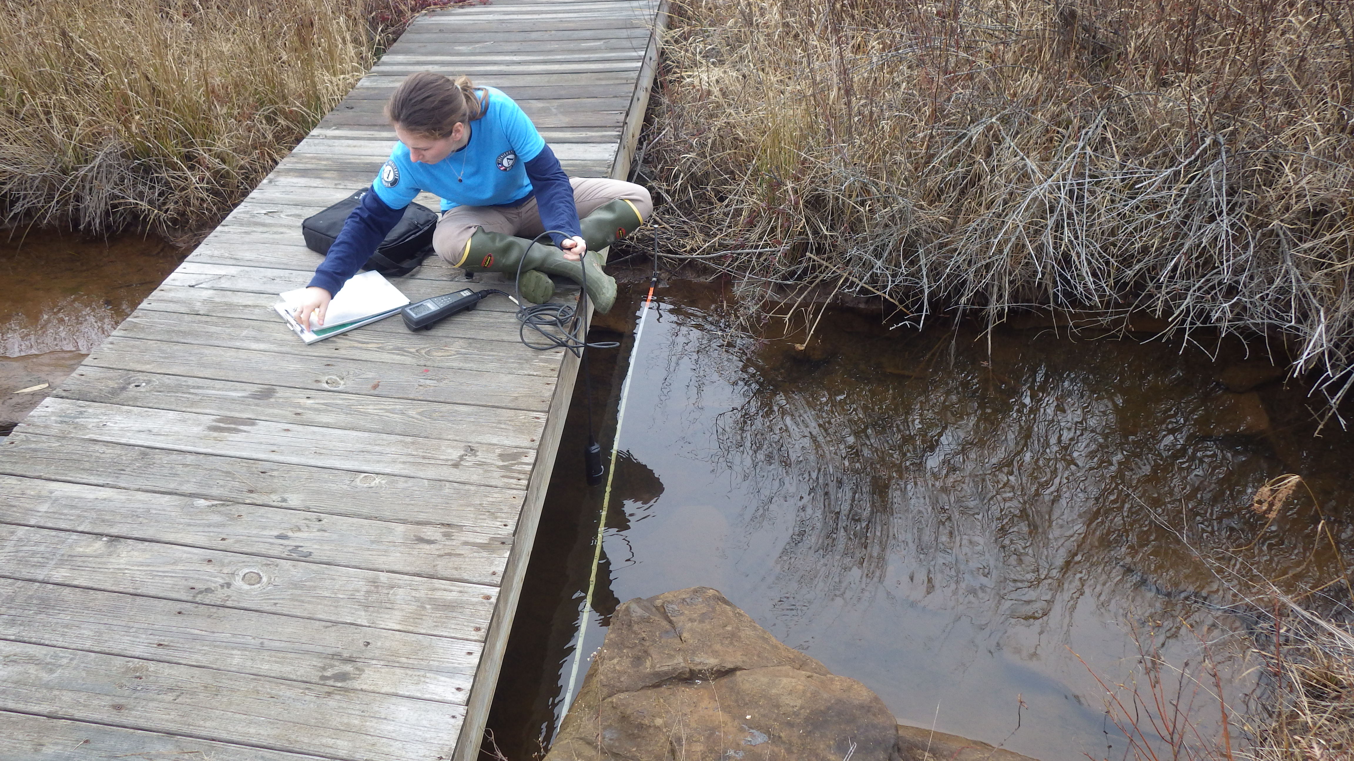 An AmeriCorps intern gathers water quality data with a YSI water quality meter at Canaan Valley National Wildlife Refuge in West Virginia.