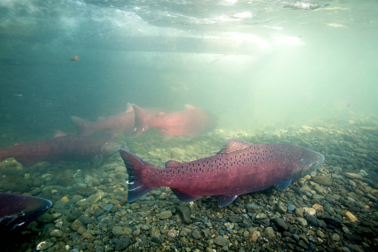 Chinook Salmon swim upstream to spawn in Alaska.