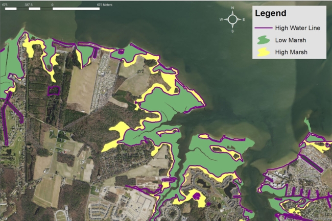 Map of coastal marsh locations relative to the High Water Line by the Delaware Wetland Monitoring and Assessment Program.
