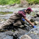 Evan Lewis, an intern with American Conservation Experience at the time of the photo, collects eDNA samples in the Okanogan River.